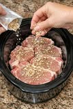 Lightly season pork chops with salt and pepper. Sear in a pan for 2β3 minutes per side until browned. - Layer in slow cooker